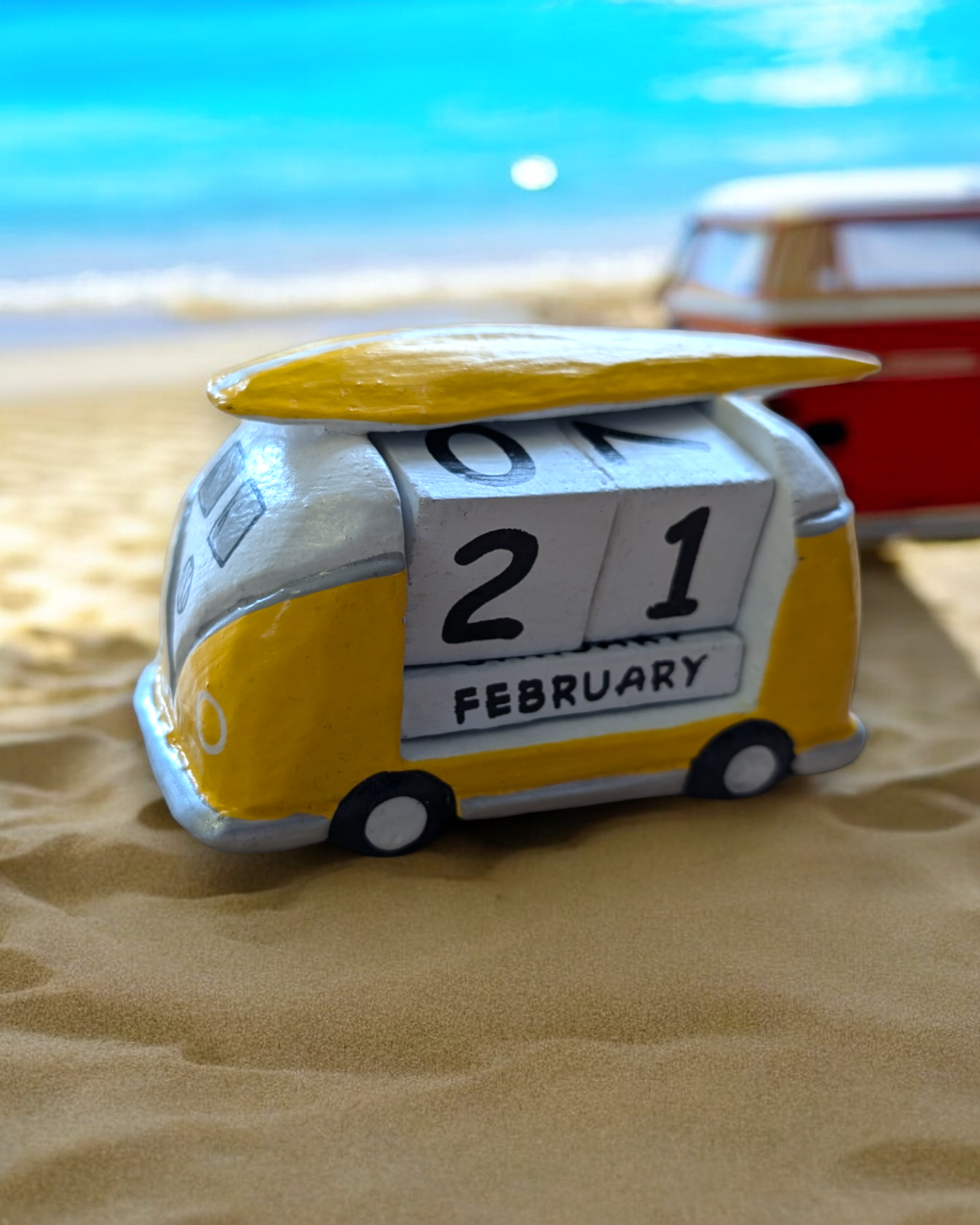 Fair Trade Hand Carved and Painted VW Style Surf Camper Van Calendar.