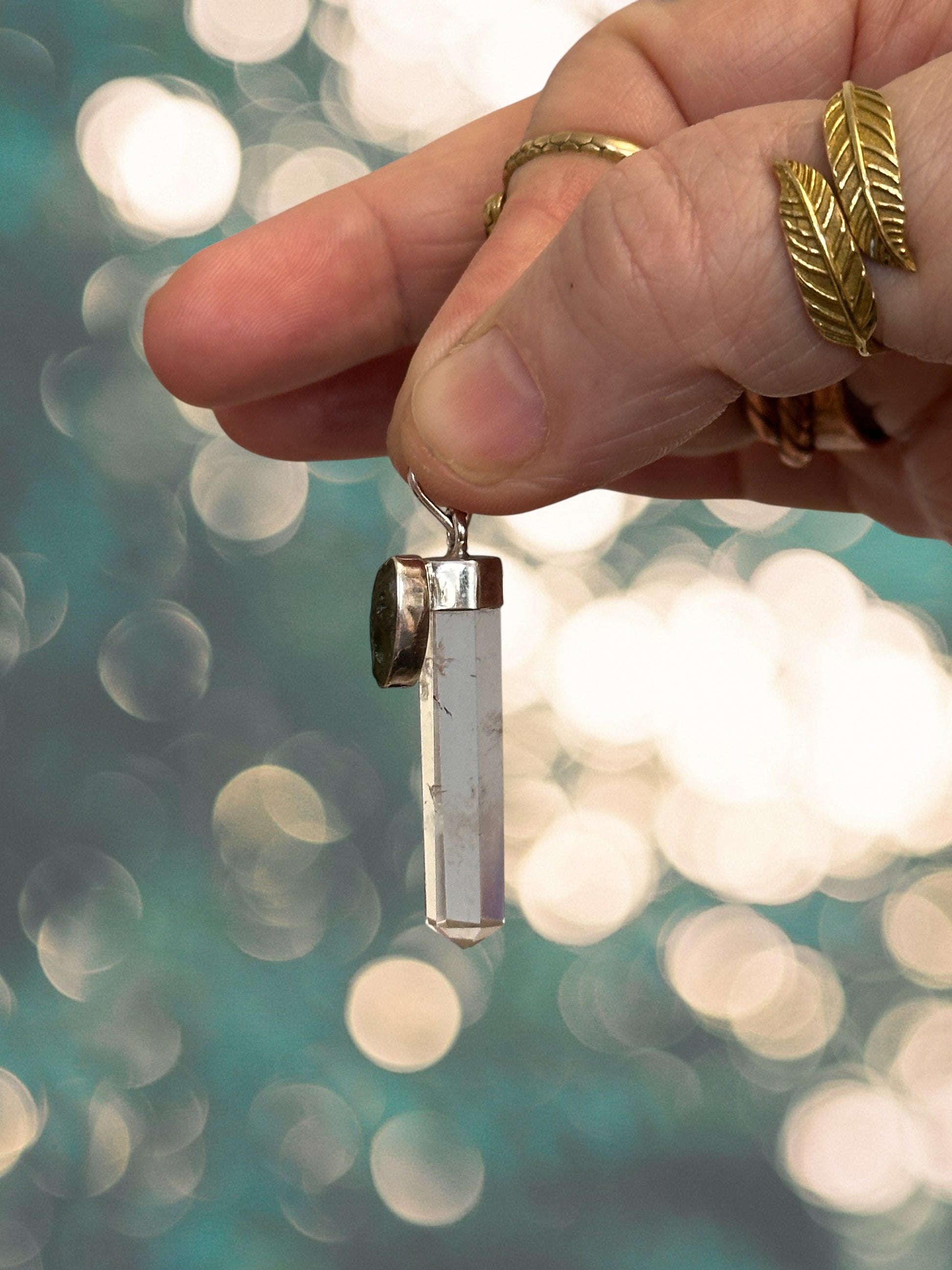 A stunning 925 stamped sterling silver pendant with a clear quartz crystal point with the addition of a genuine Moldavite stone.